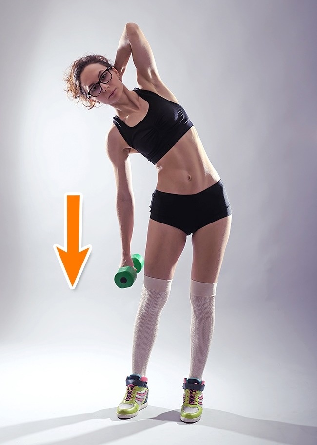 Stand straight and put your feet shoulder-width apart. Raise one hand up, and put it on the back of your head. Grab a dumbbell with your other hand, and lower it down. Make short bends toward your arm with the dumbbell. Perform 3 sets of 20 reps.