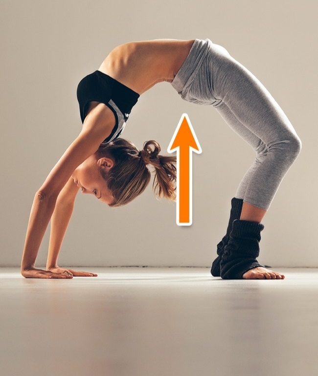 Lie on your back with your legs bent at the knees. Press your palms to the floor above your head. Then, start lifting your hips and shoulders up, while bending your back. Hold highest position for a few seconds. Then gently return to the starting position by lowering your back to the floor. Perform 2 sets of 5 seconds.