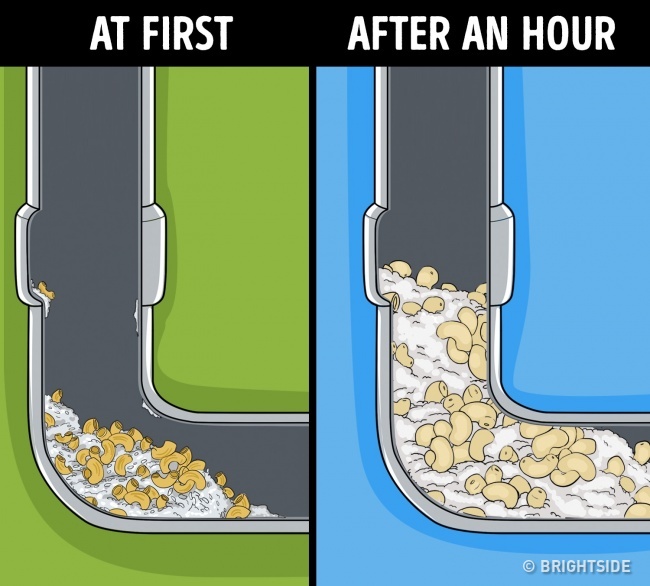 Rice and pasta, both absorb water and become bigger in time. It also takes a lot of time for them to get dissolved, which will lead to a clogged drain.
