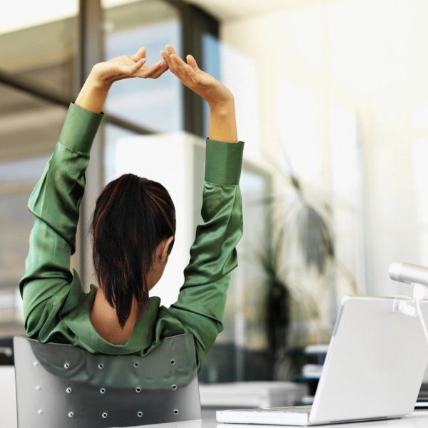 While you are sitting in your office, you can easily stretch your legs. Raise the lower part of the legs from the floor until you straight your legs and knees and feel the contraction on your muscles. Repeat this as much times as you think its enough for a relaxing feeling in your legs.