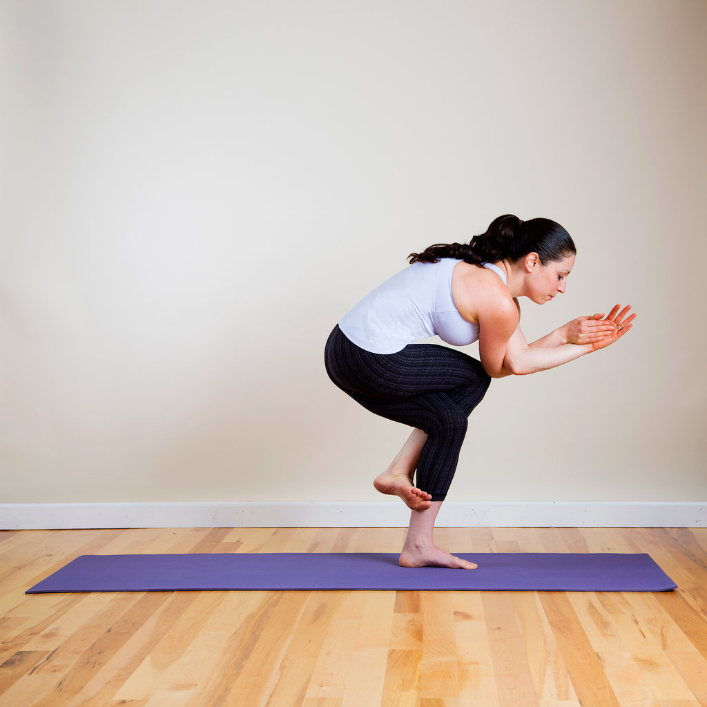 Stand up straight with your feet a little wider than your hips. Bend your knees and lower your hips towards the ground. Bring your palms together and hold them at your heart center. Press your elbows against the inside of your knees and try to open your hips even wider. Shift the weight into your heels, hold your head towards the ceiling and take 5 deep breaths.