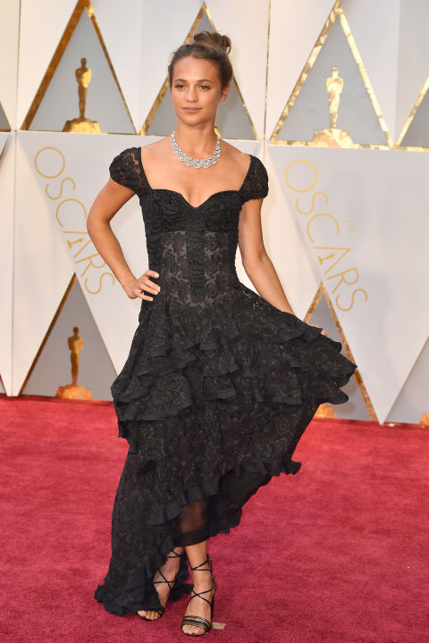 Alicia Vikander in a Louis Vuitton dress and Bulgari jewelry