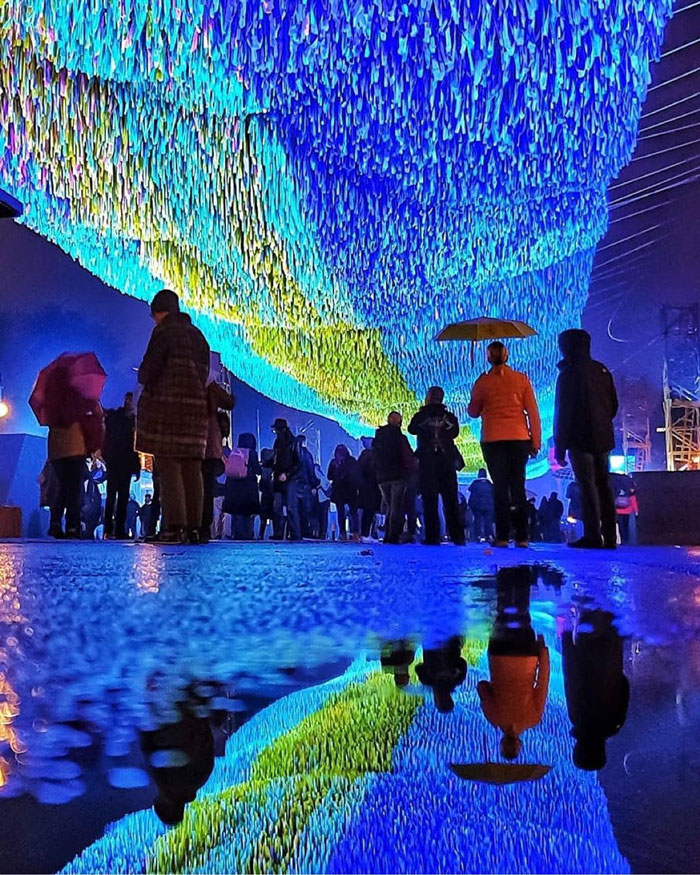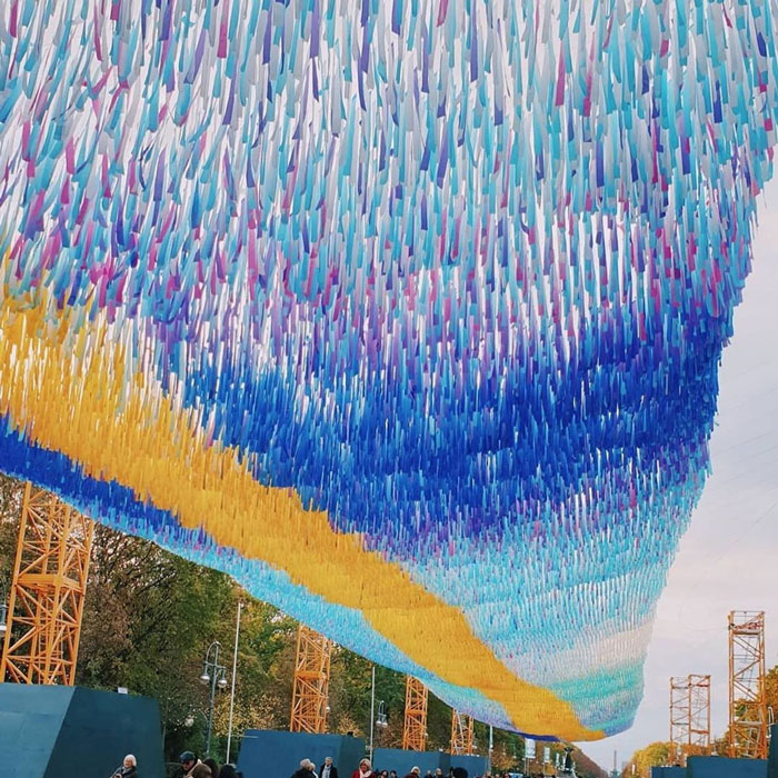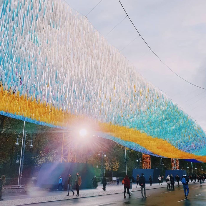 The installation consisted of 120.000 colorful and reflective ribbons carrying handwritten messages. More than 9500 feet of rope and more than 1250 hand-tied knots were used to create the gorgeous installation that made the city look breathtaking.