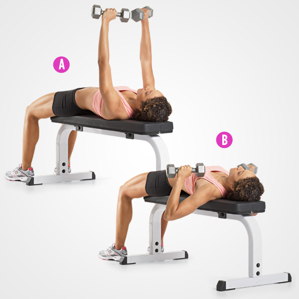 Lie on a bench with a dumbbell in each hand. Start lowering the dumbbells until they get close to the sides of your chest and then press them back up to the starting position. Do 10 repetitions.