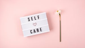 Self-care word on lightbox and flower narcissus on pink background flat lay. Take care of yourself