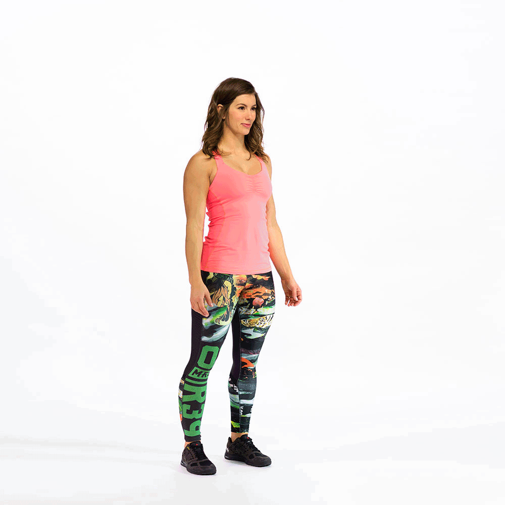 Stand straight, weight in heels and feet shoulder-width apart. Bent your knees, push your hips back. Lower into squat position to place your hands in front of the feet.