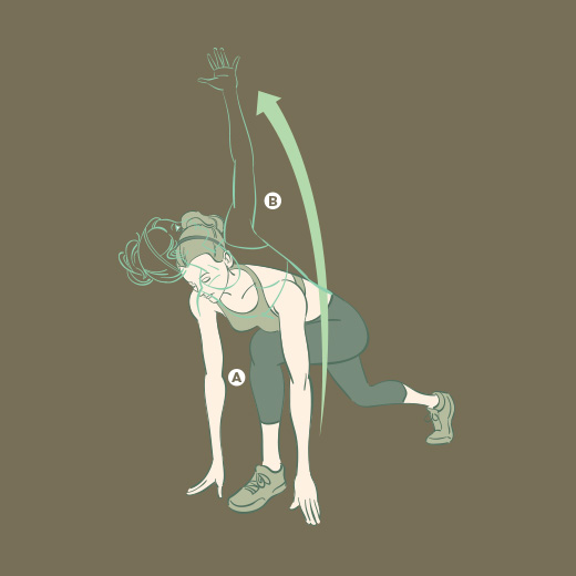 Step your left foot forward and bend your left knee to lower into a forward lunge, then bend your torso forward and place your hands on the floor on each side of your left foot. Keeping your right leg nearly straight, rotate your torso to the left and raise your left arm toward the ceiling. Make a pause and slowly reverse the movement to return to start. Do 10 reps. Then switch sides and repeat 10 more.
