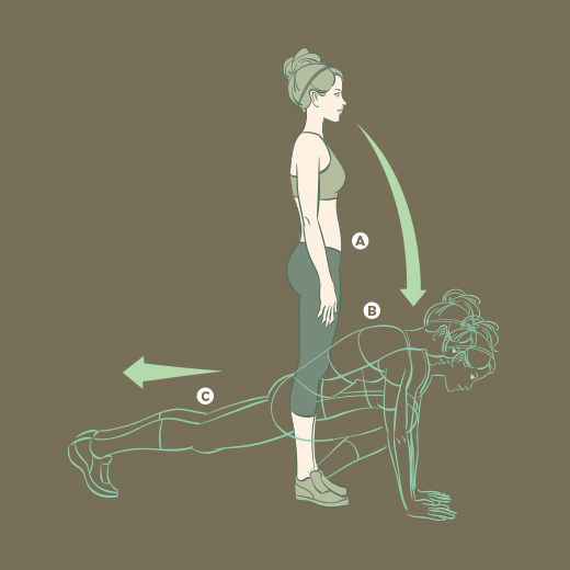 Stand with your feet shoulder-width apart and your arms at your sides. Push your hips back, bend your knees, and lower your body as deep into a squat as you can, then place your hands on the floor in front of you and shift your weight onto them. Step or jump your feet back into a pushup position. Quickly reverse the movement to return to start. Do 10 reps.