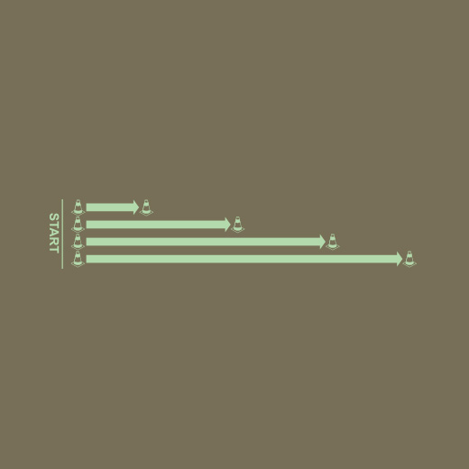 Find a space and place two cones or markers 50 yards apart, then position three additional markers roughly equidistant between them. Standing at the first marker, sprint to the second marker and bend your knees to touch the ground there with your hand, then immediately sprint back to the first marker, touching the ground again. Repeat this pattern without stopping, running as quickly as possible to the third marker, then back to the beginning, and then the next farthest marker and so on, until you have run to the last marker and back.