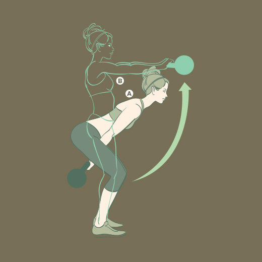Hold a kettlebell with your hands at arm’s length in front of you. Sstand with your feet slightly more than hip-width apart and push your hips back, bending your knees slightly to bring the weight between your legs. Squeeze your glutes and thrust your hips forward to swing the weight to shoulder height, keeping your arms straight and core tight. Reverse the movement, bringing the kettlebell between your legs, and continue swinging back and forth. Do 10 total reps.