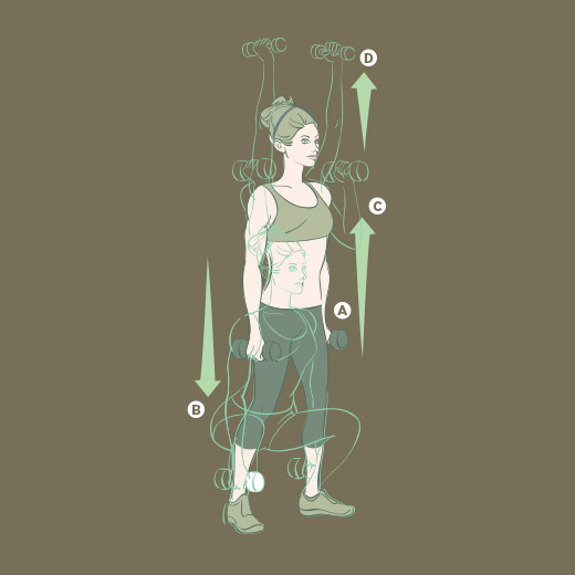 Stand with feet hip-width apart, knees slightly bent, and hold a pair of dumbbells at your sides. Keeping your chest up, push your hips back and bend your knees to lower your body toward the floor. Press through your heels to stand; bend your elbows to curl the weights toward your shoulders, then press them directly overhead until your arms are fully extended. Reverse the movement to return to start. Do 10 reps.