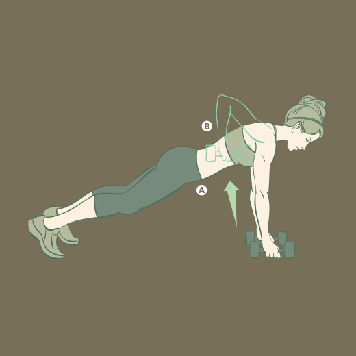 Get into a pushup position with your hands resting on dumbbells and your feet slightly more than hip-width apart. Brace your core and keep your hips parallel to the floor as you pull one weight toward the side of your rib cage. Slowly lower the weight, then repeat with the other arm. Do 10 reps.