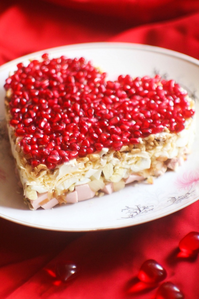 Put the ingredients in layers: chicken breast, fried onions, mayonnaise, eggs, cheese, mayonnaise, walnuts, beet, mayonnaise. Top the salad with pomegranate seeds. Enjoy this heart-shaped salad with your partner.