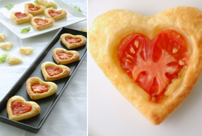 Cut out hearts from the puff pastry with the heart-shaped cookie cutter. Make smaller hearts of tomatoes. Spread the mustard on the inside and put a slice of tomato on it.
