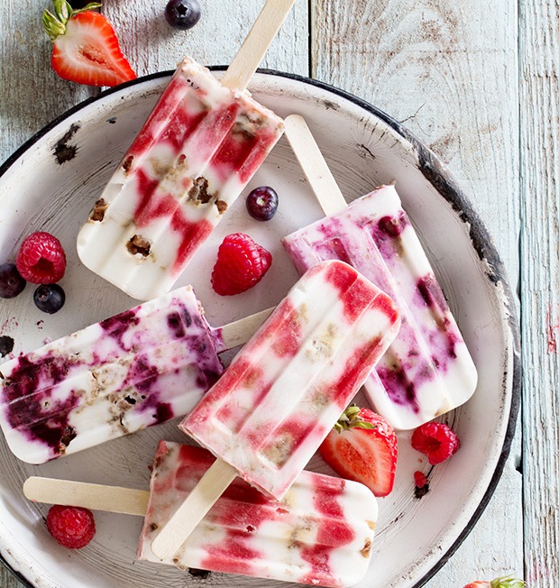 Put the strawberries and raspberries in a pot and cook them on medium heat. Cook until the mixture thickens, 10-15 minutes. Remove the pot from the heat and let it cool. Do the same with the blueberries. In a big bowl, add the milk, Greek yogurt and honey and mix. Pour 1 tablespoon of yogurt in each mold, 1 tablespoon of granola and then 1 tablespoon of fruit jam. Repeat until you completely fill the molds. Add the popsicle sticks and place them in the freezer.