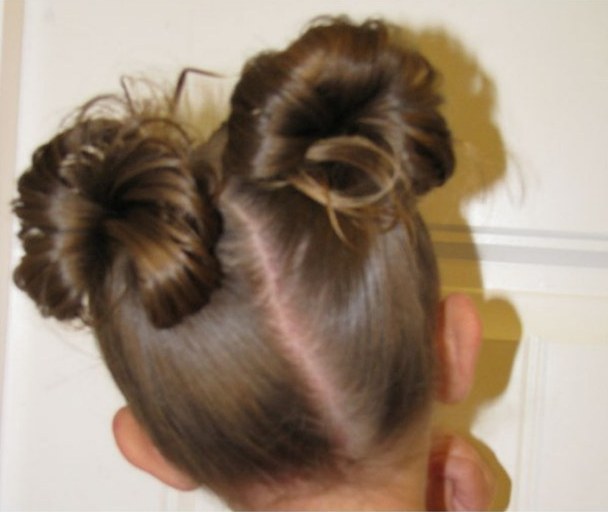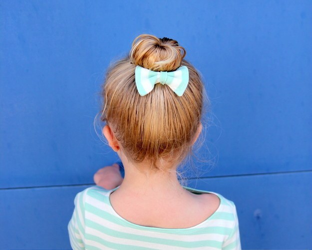 Grab kid`s sock and cut off the toe. Roll the sock down into a tube. Put the hair up in a high pony tail. Slide the tube onto the ponytail. Separate the ponytail into two sections, half in front and half in back. Bring the tube to the top of the ponytail. Place the ends of the ponytail around the tube. Begin rolling the tube back toward the head. Once the hair is rolled around the tube, use the hair to cover the tube. Add a colorful bow.