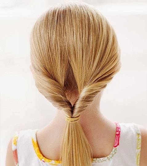 Gather the hair into a low ponytail. Push the band down slightly, leaving two inches of hair above it. Make a “hole” in the middle of the hair using your fingers. With your other hand, turn over the end of the ponytail under and up through the hole. Slowly pull the ponytail through.