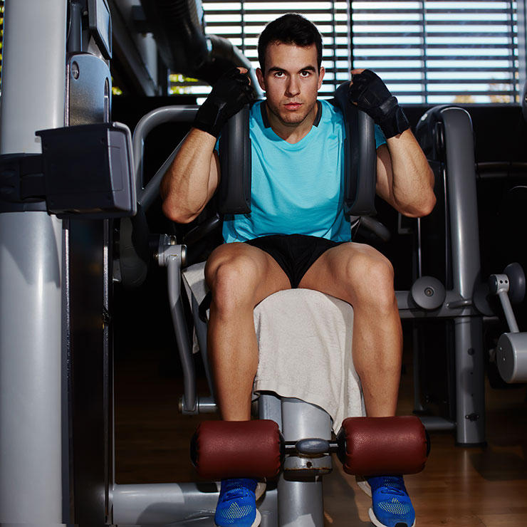 “Most people are seated too low with their head jutting forward, a rounded spine, and elbows flared high. This signals that you’re pushing too much weight, and that’s when injury can occur: when your shoulders overcompensate because your chest muscles can’t handle the weight. Set the seat height enough that the hand grips line up approximately with the nipple line. Sit tall with your chest up, head back against the head rest, and your ribcage down slightly to avoid hyperextension in the low back.” explains Crunch personal trainer Butch Sand.