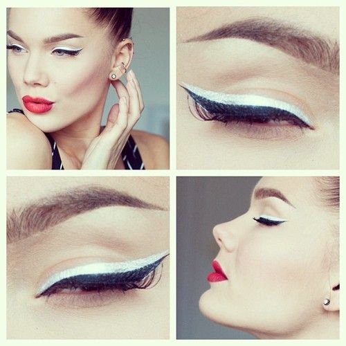 This look is dramatic and cute at the same time. Apply the black eyeliner first, doing a cat eyes. After it’s dried, add a white line following the black line. Instead of white you can also use silver eyeliner. Choose your favorite red lipstick and you’re set to go.