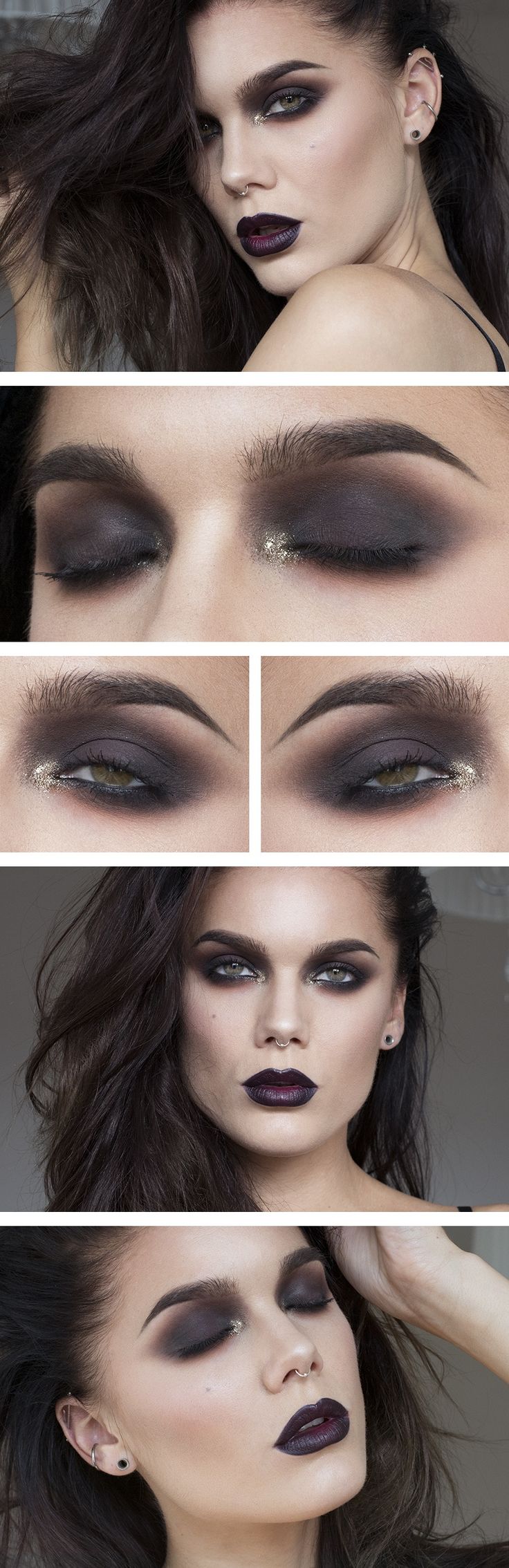 For this look you’ll need only two things: black eye shadow and black eyeliner. Use a good brush and apply the black eye shadow all over the upper eyelid and on the bottom eyelid. Don’t go for a straight line, this look should be imperfect. Take your black eyeliner and frame your eyes. You can also apply some on the water line for a more dramatic look. Add some gold glitter in the inner corner of your eyes. If you’re more daring, use a dark burgundy lipstick.