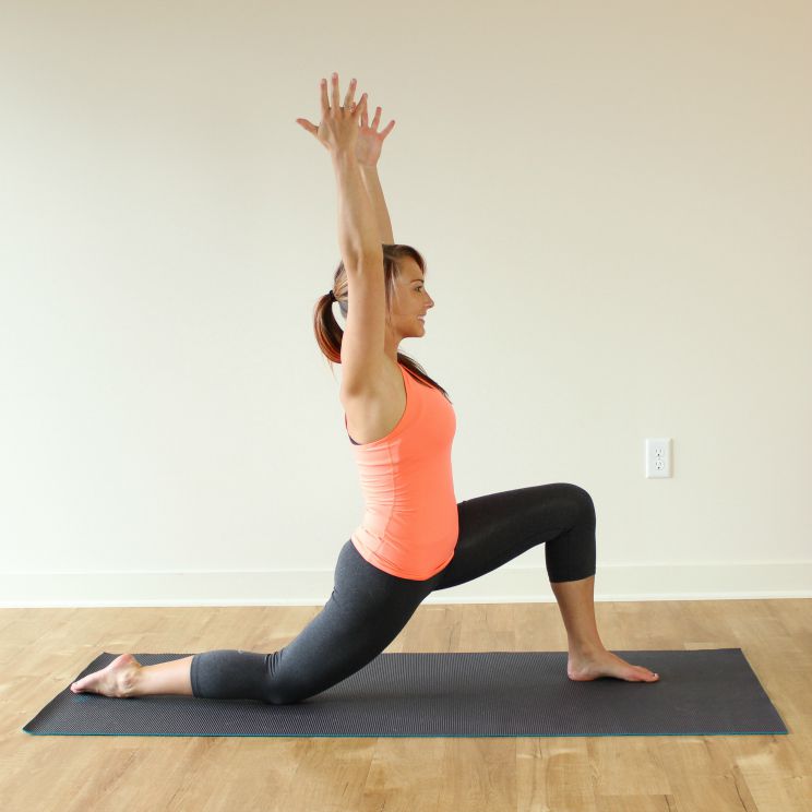Do a runner’s lunge with right foot forwards. Lower your back knee and slowly lift your chest and arms up. Do not allow your back to arch. Reach your arms overhead and lean forwards. Hold the pose for 30 seconds and repeat it on the other side.
