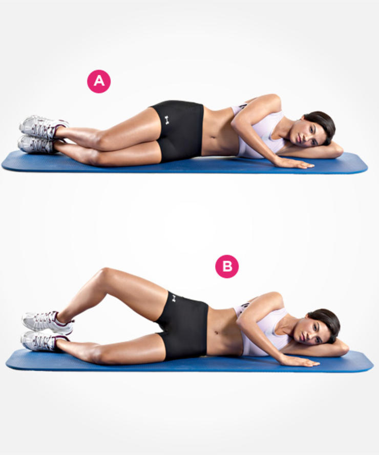 Lie on your left side. Bent your knees at a 45 degree angle. Keep your feet touched and start raising your right knee as high as you can. Pause for a second and return to starting position.