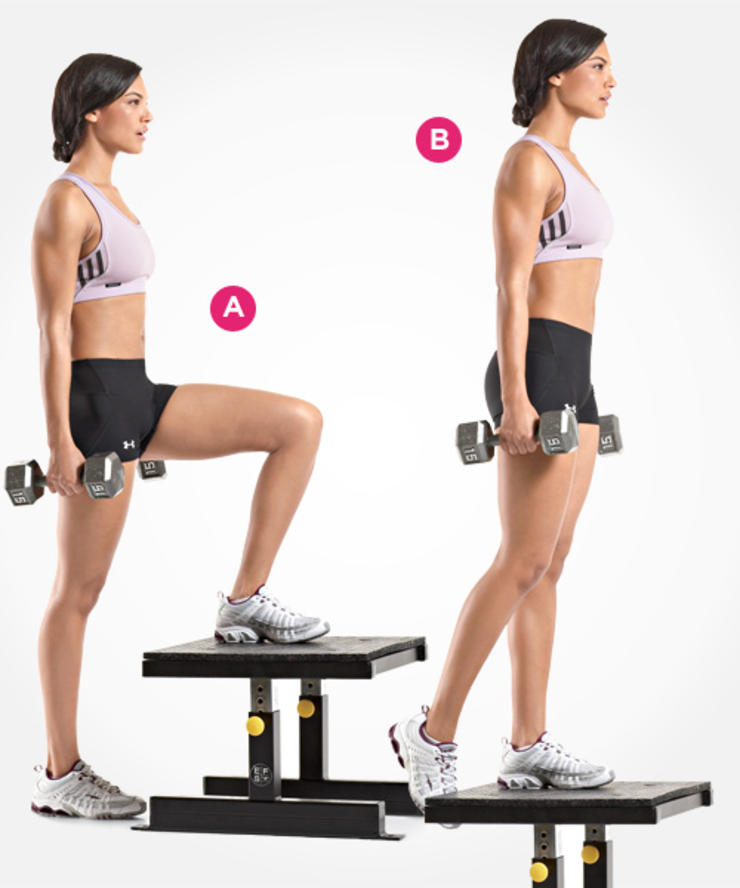 Grab the dumbbells and stand in front of a step or bench. Place your left feet on the step with your knee bent 90 degrees. Press your left feet and push your body up until the left leg is straight and you’re standing on one leg. Your right foot should be elevated. Get into starting position and repeat. Do the exercise with your right leg also.