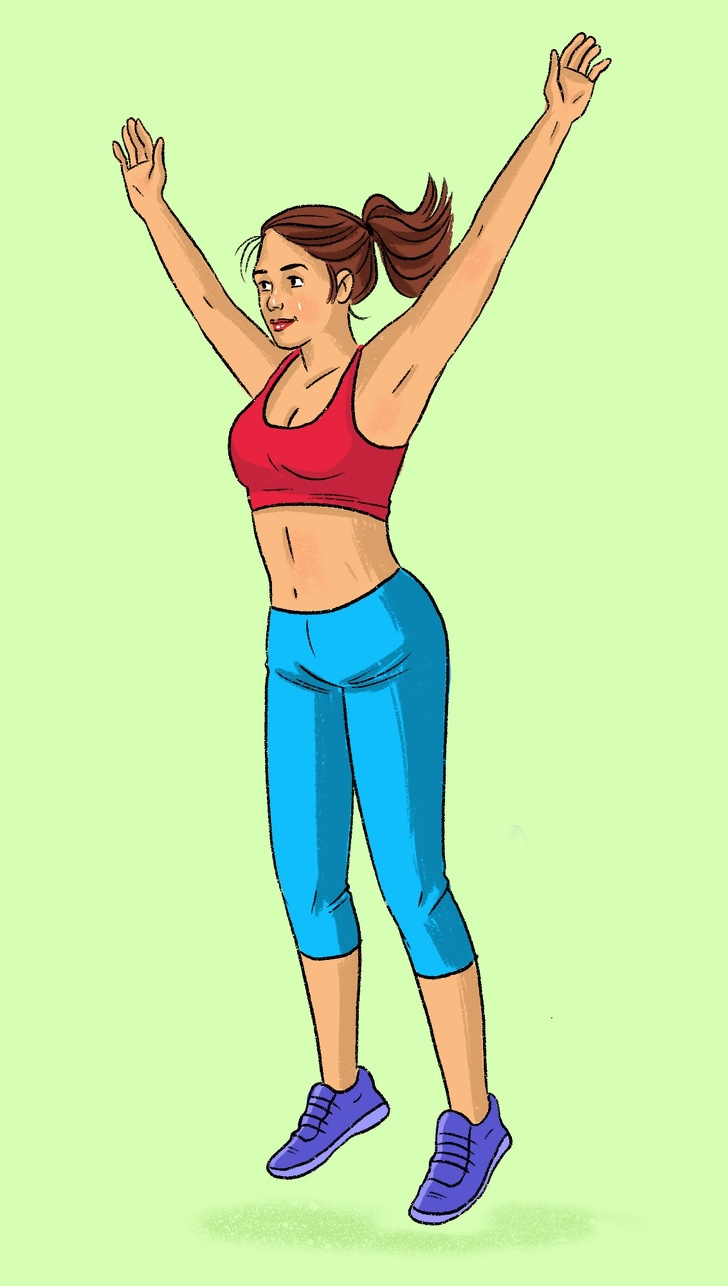 Stand straight with your feet together and arms at sides. Bend your knees while trying to send your hips back. Get into a half-squat. Make a sharp jump while spreading your legs and arms in a star shape. Land carefully and get back into starting position.