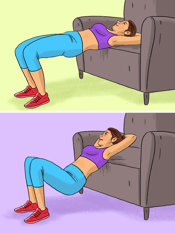 Grab a chair and sit down in front of it, with your back to it. Bend your knees and put your hands on the chair handles. Straighten your shoulders and push your chest forward, while keeping your head back. Strain your belly, buttocks and thigh muscles. Stay in the position for a couple of seconds and get back into starting position.
