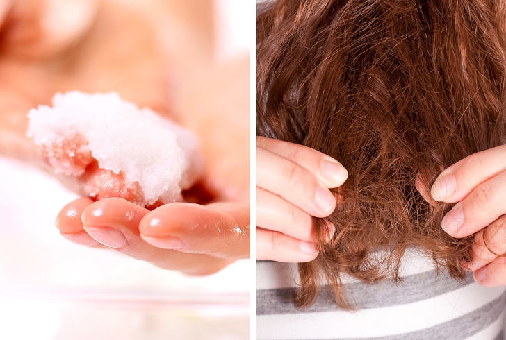 Rinsing your hair with water and salt and doing salt sculp scrubs is actually ok, but you need to be aware of a couple of things. You shouldn’t use salt masks if you have any injuries on your head because it can cause burning of the scalp. Don’t use salt if you have dry hair since it can cause hair loss and hair damage.
