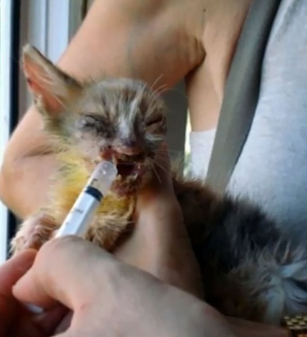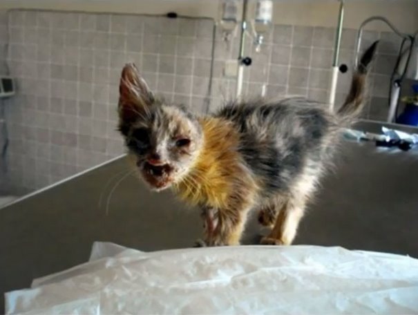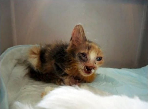 The little girl found the cat between the garbage cans, malnourished, shaking and miserable. She picked up the kitten and took her home. She begged her father to help this poor feline. They took the cat to the vet where she got medicines. Vets even surgically repaired her rough features.