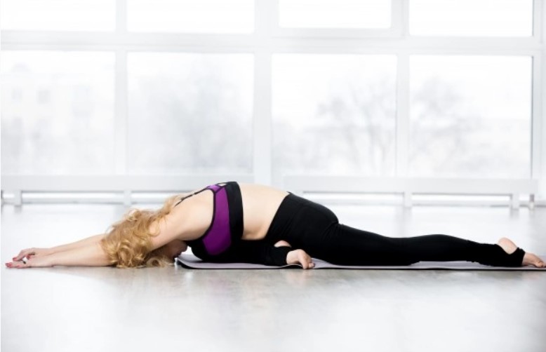 Place a pillow in front of you and sit on the floor. Bend your left knee and bring your sole of your left foot to your right inner thigh. Lift your butt and extend your right leg behind you/. Gently hinge forward from your hips and place your head on the pillow. Extend your arms forward with your elbows slightly bent. Hold the pose for 10 breaths. Roll back up and switch legs.