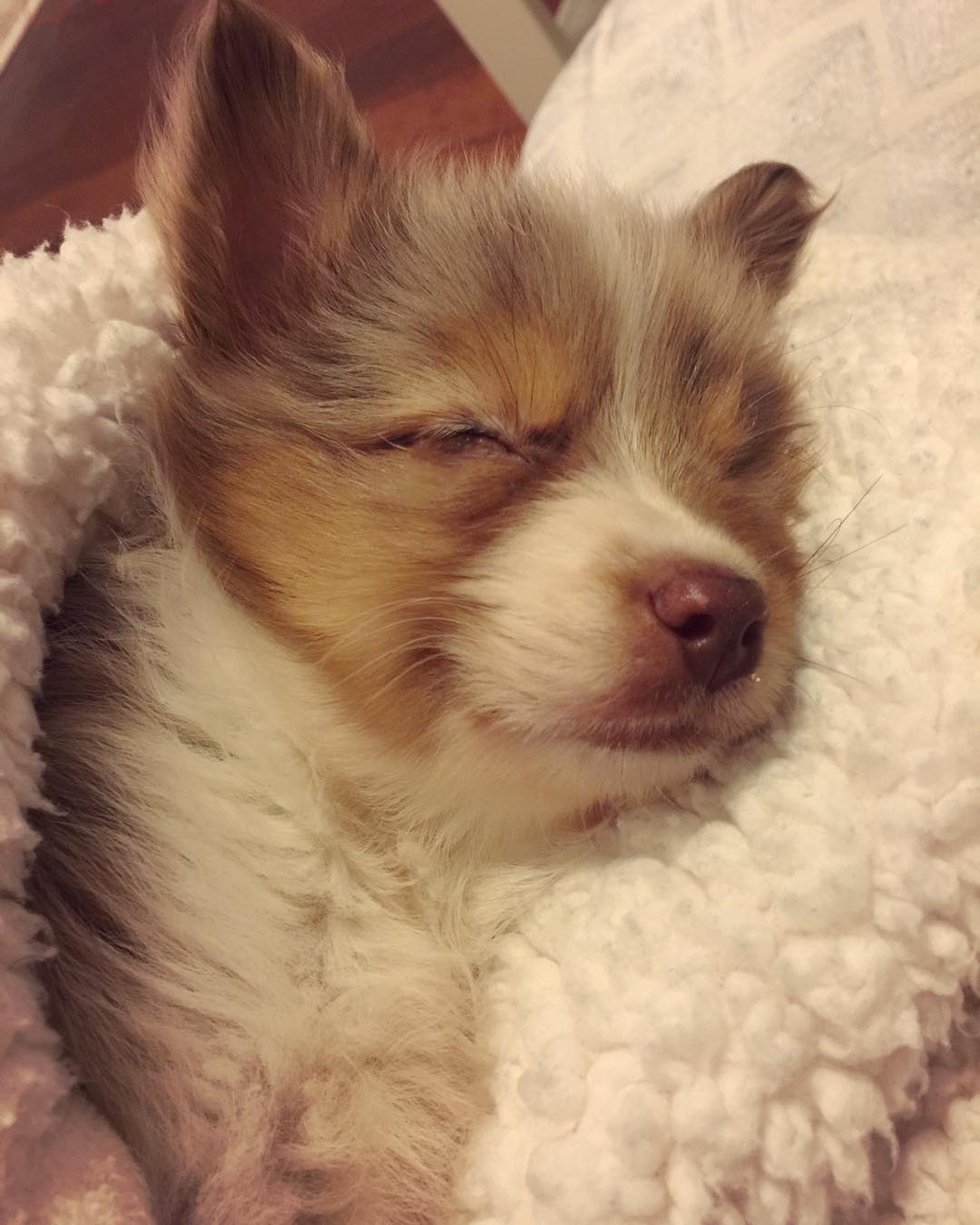 “Sometimes he’ll run into things and you can tell he has some problem with his depth persecution, as do I. He’s playful, loves to be held, has the cutest little bark and gets along great with the whole family.”