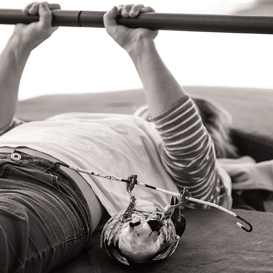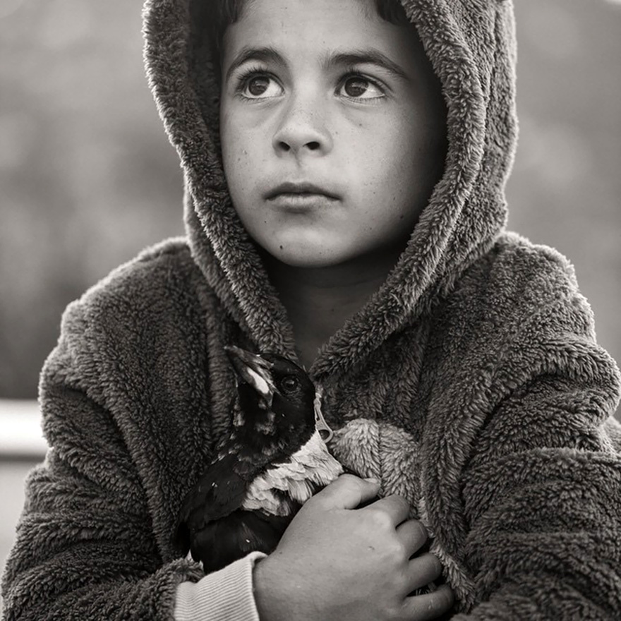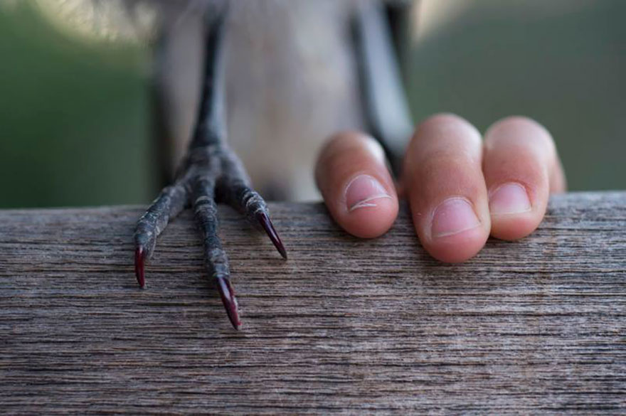 “Little baby magpie came into our lives when she fell from a tree at about 3 weeks old. We gradually nursed her back to health with a proper Magpie diet and lots of cuddles.“