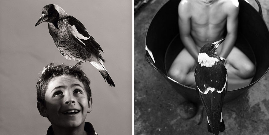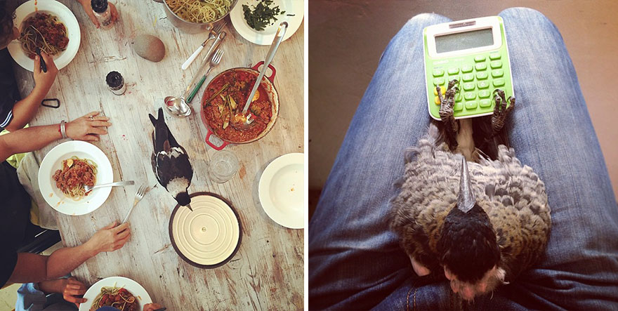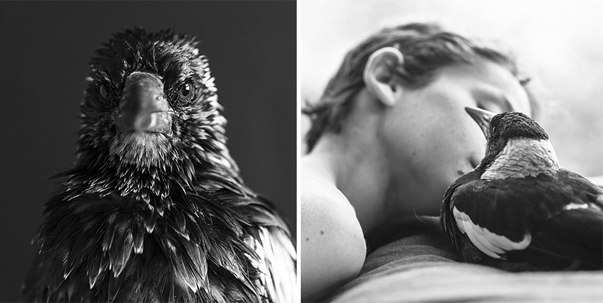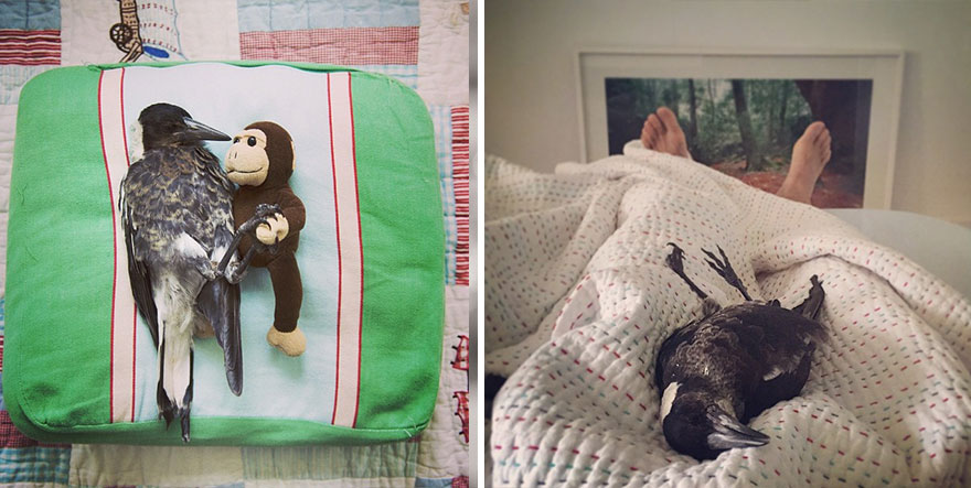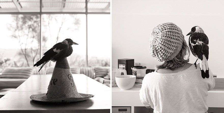 “A few months ago there was another baby magpie, a local one. She started playing with it and it came into the house. Penguin and this one were just… talking and carrying on together. It was really cool.”