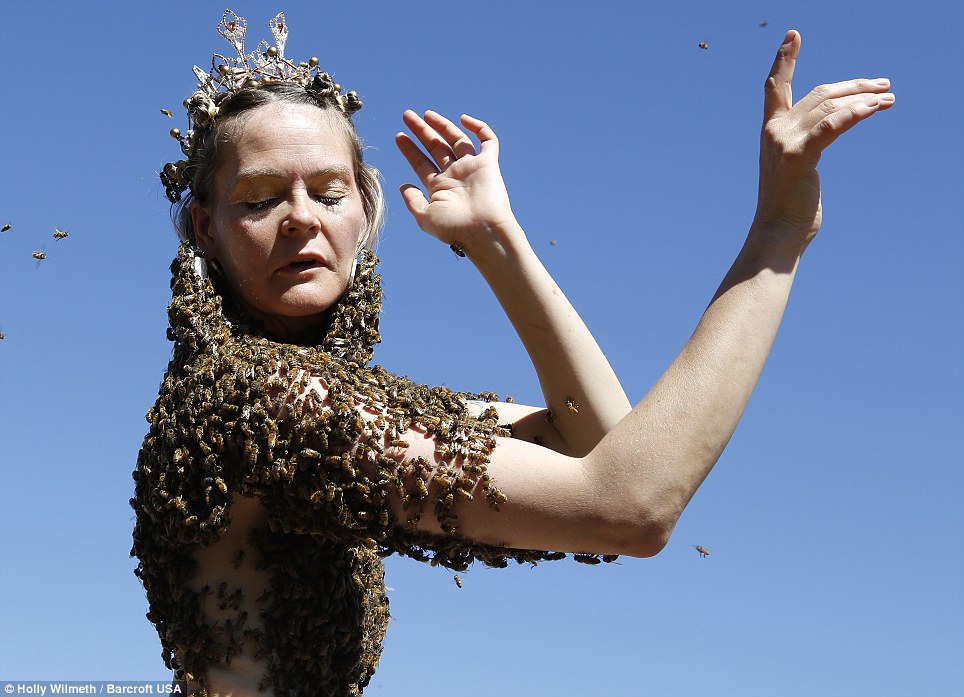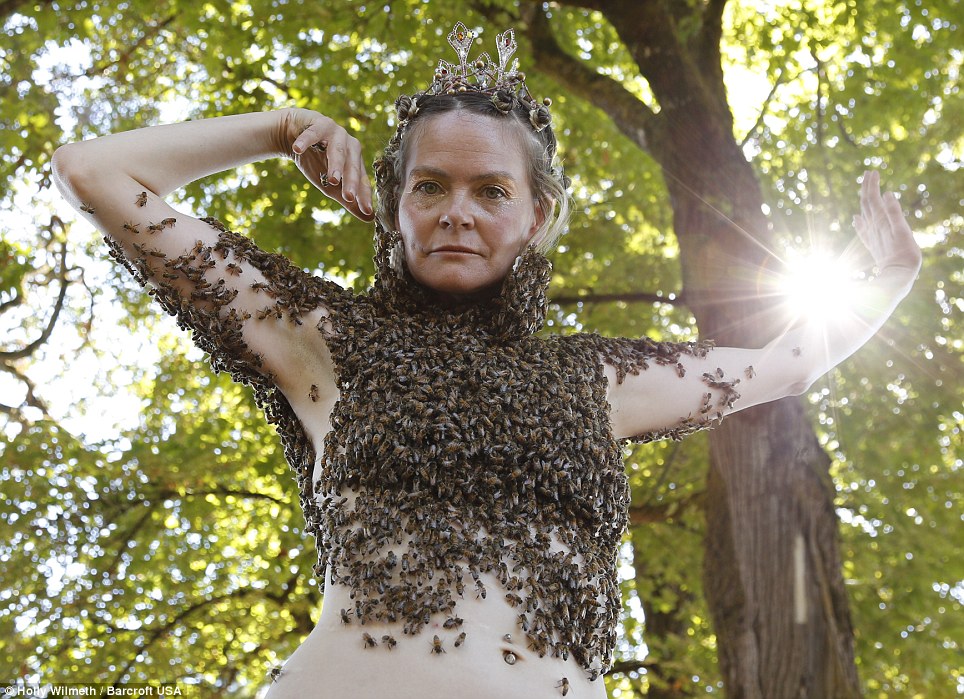 Sara is an Oregonian artist and energy therapist that wears a coat made from thousands of bees on her topless torso. Her bee performance aims to help people conquer their fears and become one with nature.