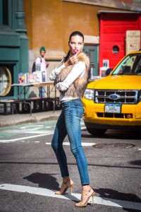 Adriana Lima poses as she models on a photo shoot for Maybelline in Soho