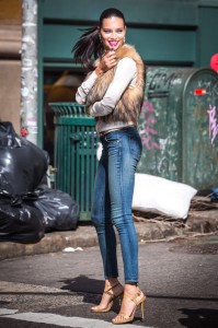 Adriana Lima poses as she models on a photo shoot for Maybelline in Soho