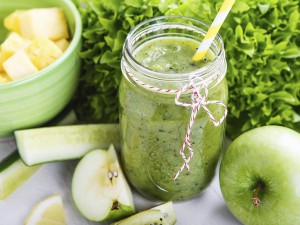 Fresh organic green smoothie with salad, apple, cucumber, pineap