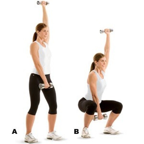 Stand with your feet shoulder-width apart and hold a weight in each arm. Hold one arm overhead and the other hand between your legs, keeping both arms straight. Push your hips back and lower yourself until your upper thighs are parallel to the floor. Keep your abs tight. Get back to the start position and do 15 repetitions. Switch arms and repeat the exercise.