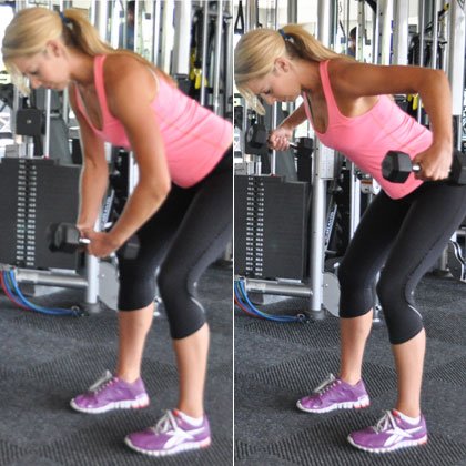 Stand with feet hip width apart and hold a 15-25 pound dumbbell in one hand. Bend your knees and shift your hips back. Lower your torso so it gets parallel to the floor. Support your right hand on the wall for balance. Draw the dumbbell toward your chest by bending your left elbow straight toward the ceiling. Do 10 repetitions on each side.