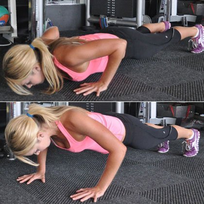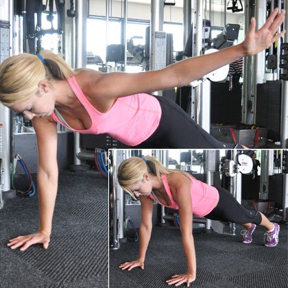 Get into a plank position. Keep your hips still and lift one arm to shoulder height. Return the arm to the center and then lift the other arm. Keep your body centered. Do 10 reps each side.
