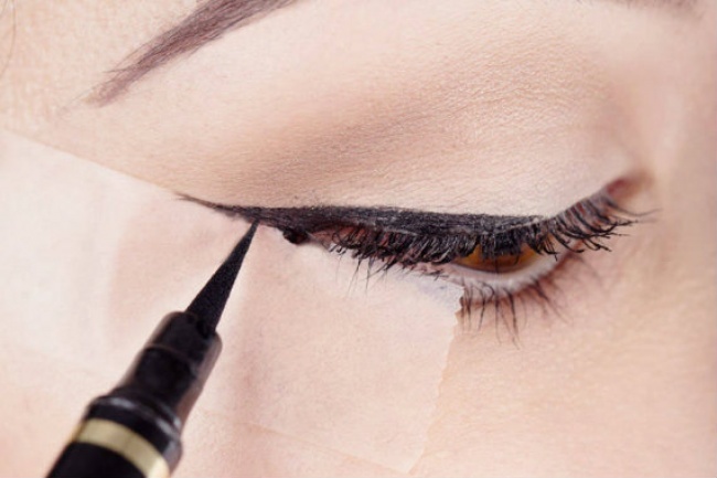 Use a scotch tape to get the perfect cat eye. Put a piece of scotch tape on your outer corner and draw a line with your eyeliner.