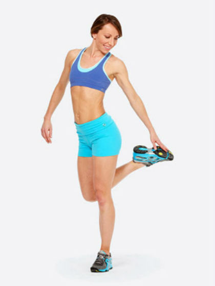 Stand on your left leg and bend your right knee towards the butt, reaching your right foot with your left hand. Then quickly return to the side lunge. Do 20 repetitions of this exercise, and then switch your legs and repeat.