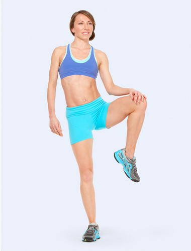 Stand up on your right leg, and then bent your left knee directly out to side at the level of the hip, tapping left hand on left knee. Then, quickly return to curtsy position. Do 20 repetitions of this exercise, and then switch the sides and repeat.