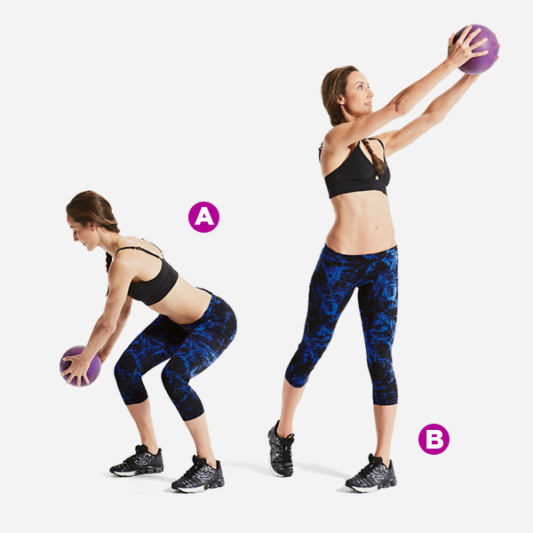 Keeping your arms straight, brace your core and stand up, raising the ball diagonally above your left shoulder (b). Then pause and return to the start position. That’s one repetition. Do 5 reps and then switch the sides.
