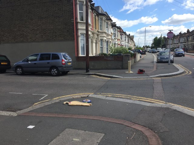 The poor cat has been abandoned in the middle of the street with all his stuff.