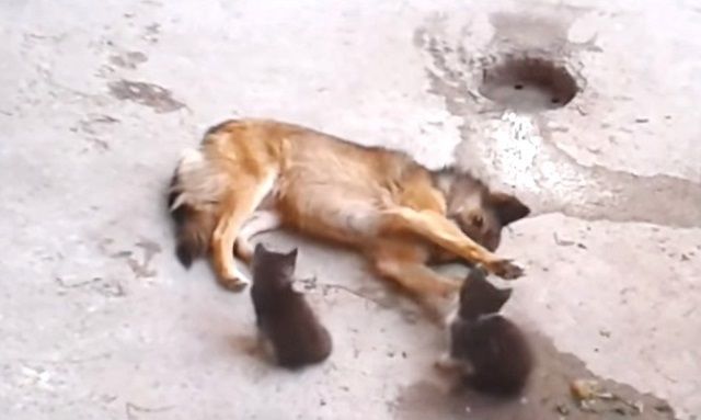 Take a look at the amazing video of the dog and the kittens: