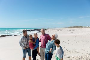 Front view of a multi-generation Caucasian family standing on the beach with blue sky and sea in the background, embracing, smiling and having fun