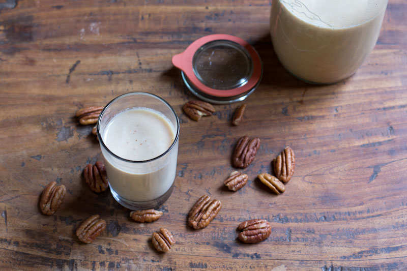 In a big bowl, add 1 cup of pecans and 2 cups of water. Let them soak overnight. Drain the water and place them in your blender. Add 1 tbsp. vanilla extract, 1 tbsp. honey, a pinch of salt, 1 tbsp. unsweetened cocoa powder and 4 cups of water. Blend everything well. Strain the liquid using a cheese cloth. Keep it in the fridge for 1-2 hours before drinking.